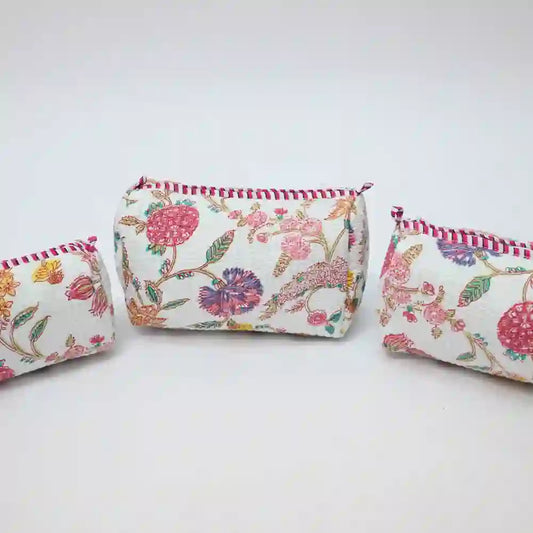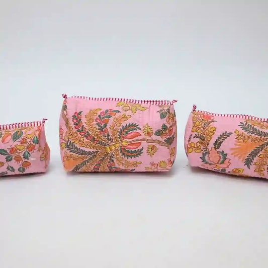 Pink Paradise handblock printed & quilted travel pouch (Set of 3)